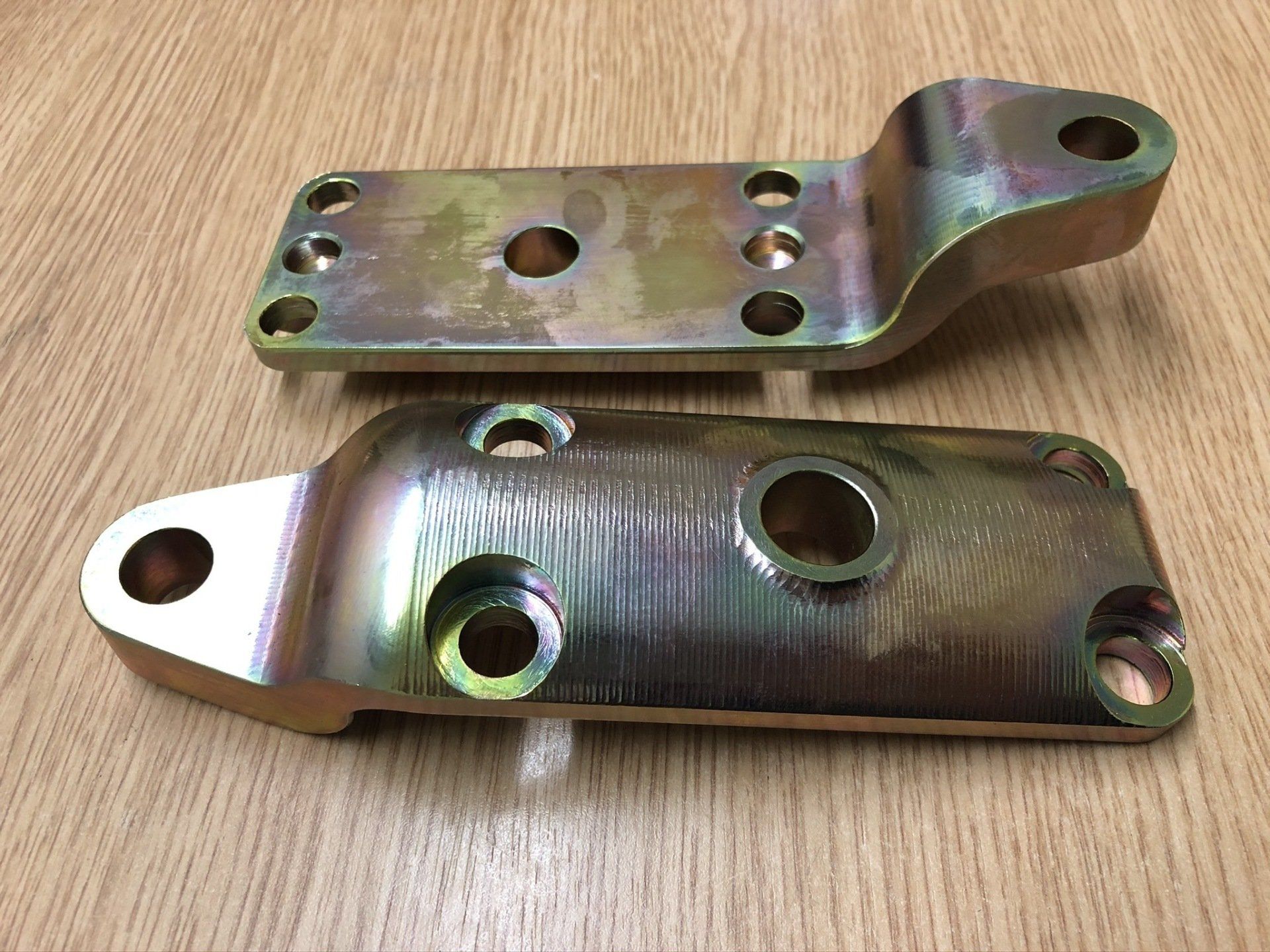 This kit was designed after owners and racers complained the front of the T cars looked high, but lowering them too far upset the geometry and therefore handling. These anodised spacer blocks lower the front of the car approximately 25mm without changing the damper position (and therefore travel) or the all important lower wishbone position. The position of the steering arm relative to the lower wishbone does not change either. These have been used on race cars with great success as well as road cars to improve aesthetics and handling. They come as a kit that includes longer high tensile mounting bolts.